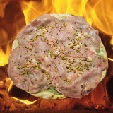 Tomate, Olives, Champignons, Jambon, Rosette de porc, Lardons fumés, Emmental, Mozzarella
